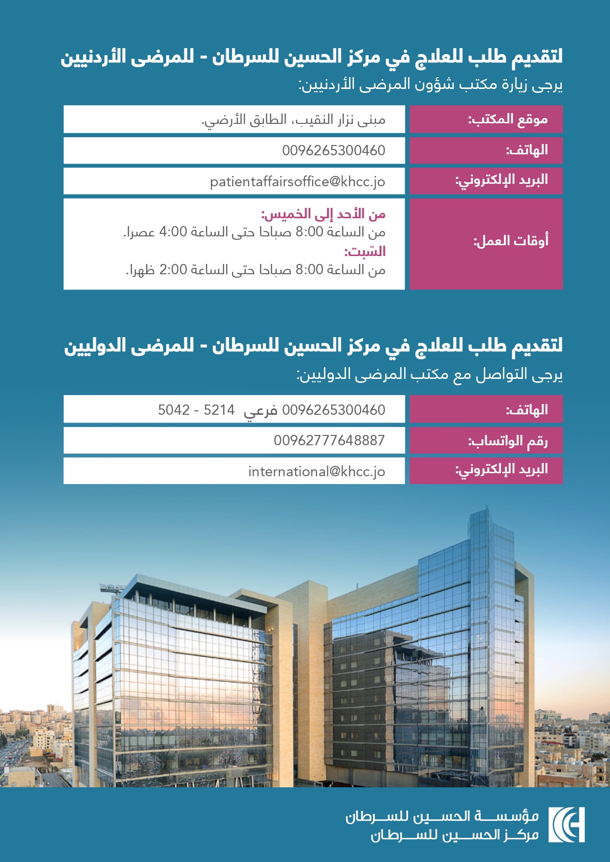 - البريد الإلكتروني: patientaffairsoffice@khcc.jo